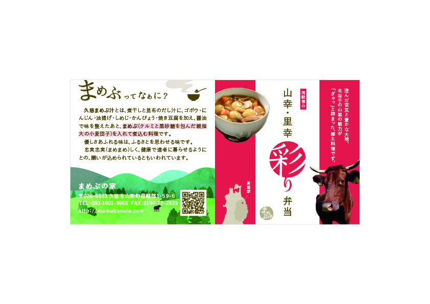 岩手県久慈市にある飲食店「まめぶの家」のロゴ・お弁当ラベル・のぼり旗・パンフレット・木製ハンコを制作しました。